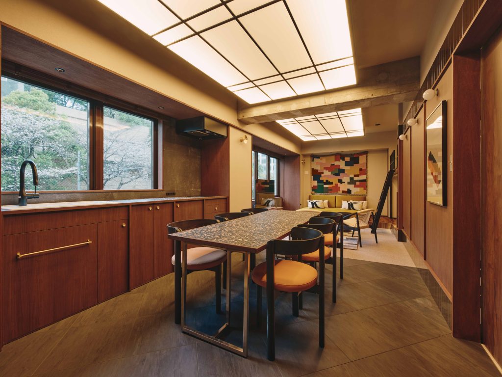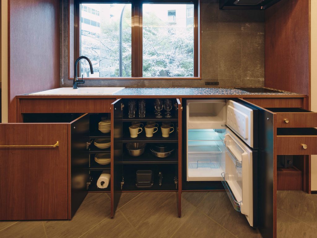 約2.7mのキッチンには、厳選された家電や調理器具を完備。食材を広げる時間さえも、いつもより少し特別で、愉しいものへと変わっていく。キッチンカウンターやダイニングテーブルには、テラゾータイルを使用。シックなウォールナットの色彩を基調とする部屋に、不規則なタイルのデザインが楽しさと素材感を添える。