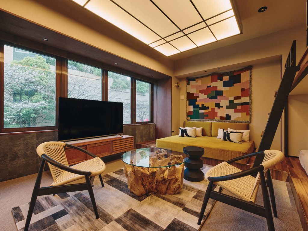 大きな窓から自然光が降り注ぎ、虎ノ門の街並みと溶け合う開放的な空間。部屋の中央奥に配されたマスタードイエローのソファベッドは、この部屋における「くつろぎの特等席」として、日常の延長にあるような温かな居場所をつくり出す。