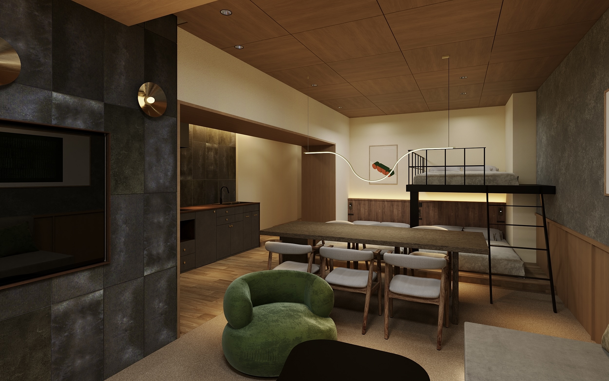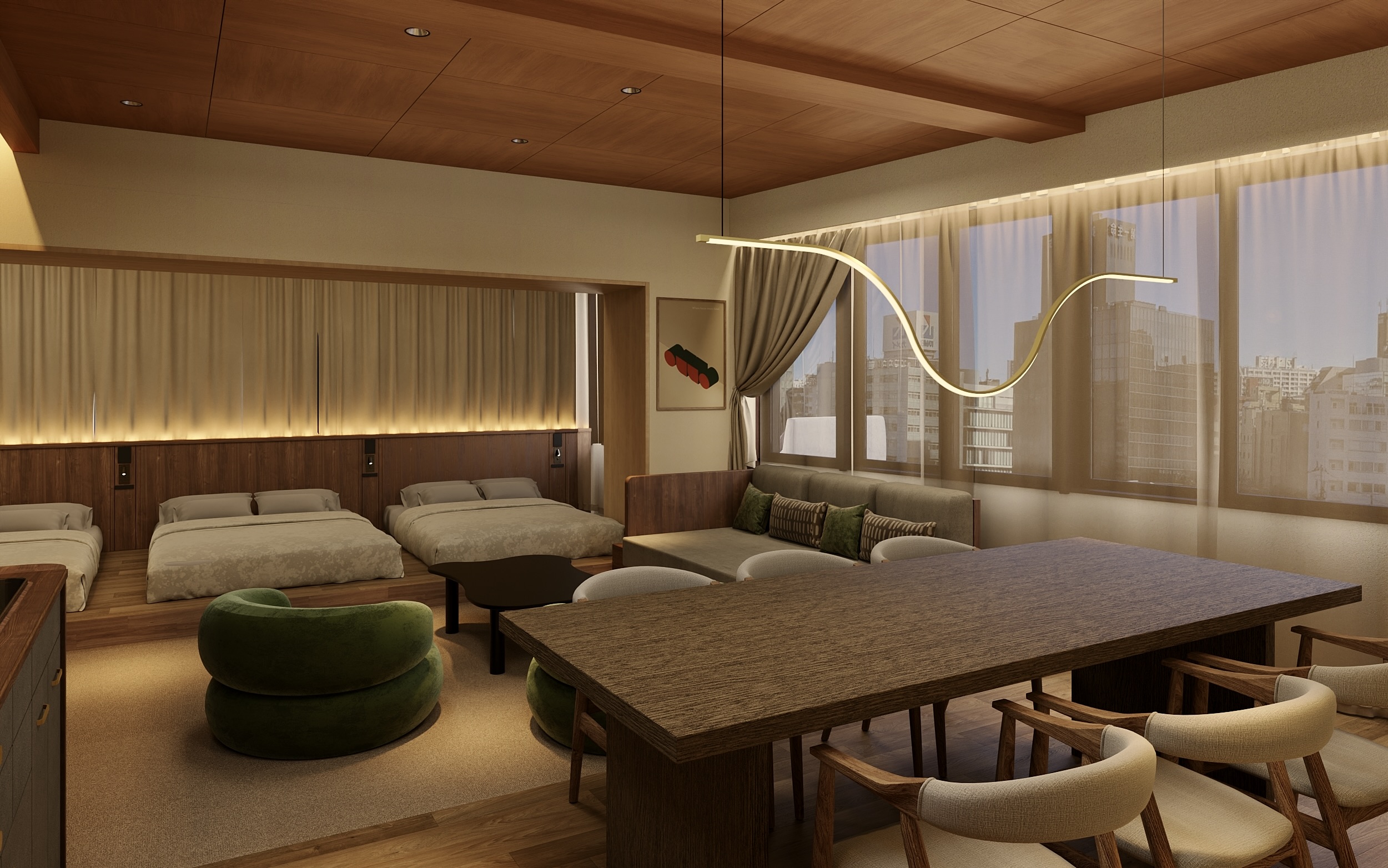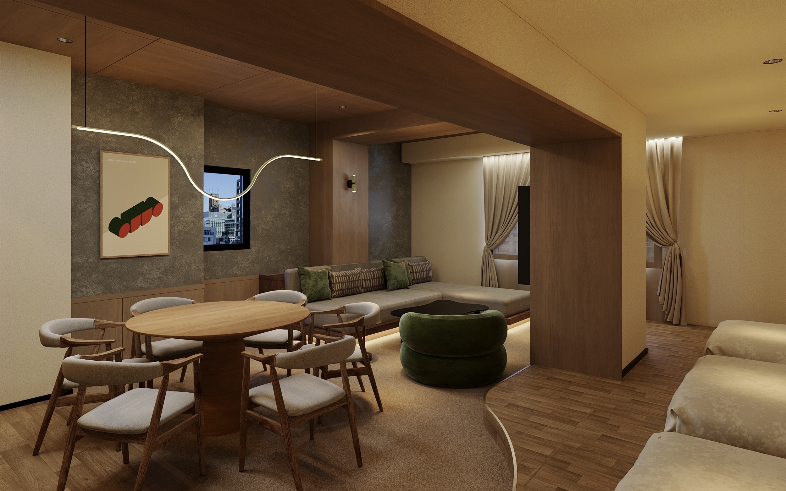「Urban Retreat」をテーマに、天井の木目デザインや壁面の石の素材感、各所に施した間接照明が洗練された上質な空間を生み出し、グリーンのアイテムがミッドセンチュリーの遊び心と温かみを添えます。それぞれの過ごし方に寄り添うゾーニングと心地よいインテリアが、思い思いのくつろぎを自然と生み出します。交通利便性に優れ、多彩な飲食店が集まる五反田で、時間の流れがそっとゆるむひとときをお楽しみください。