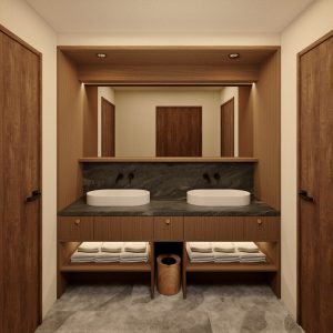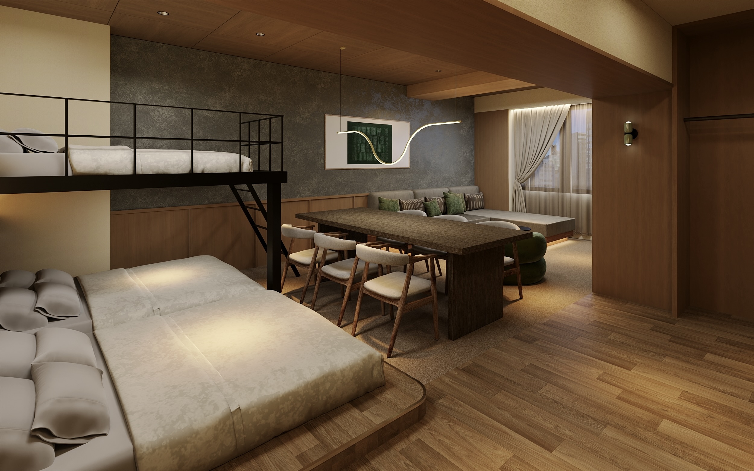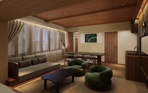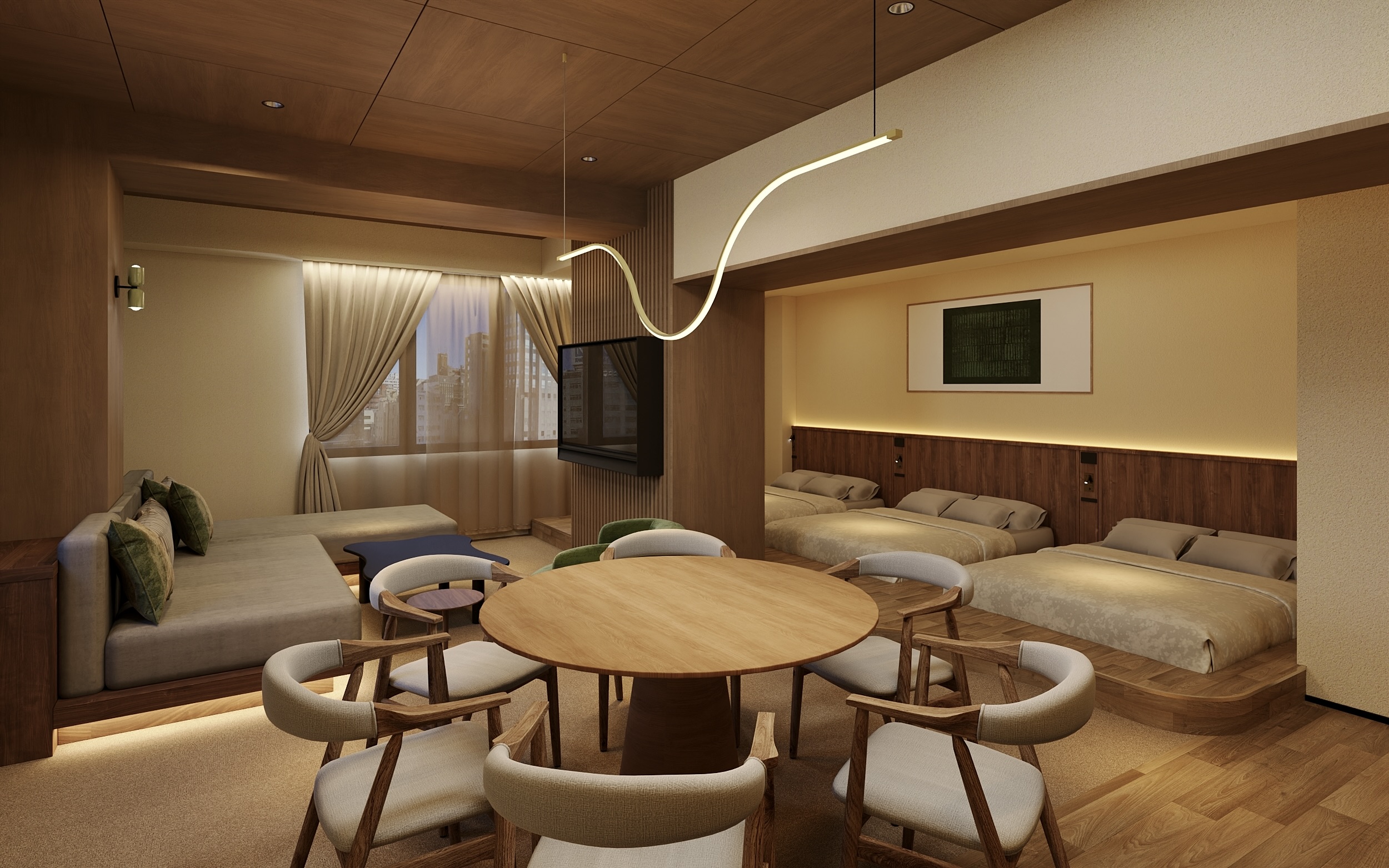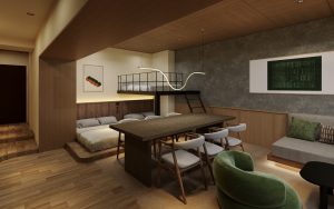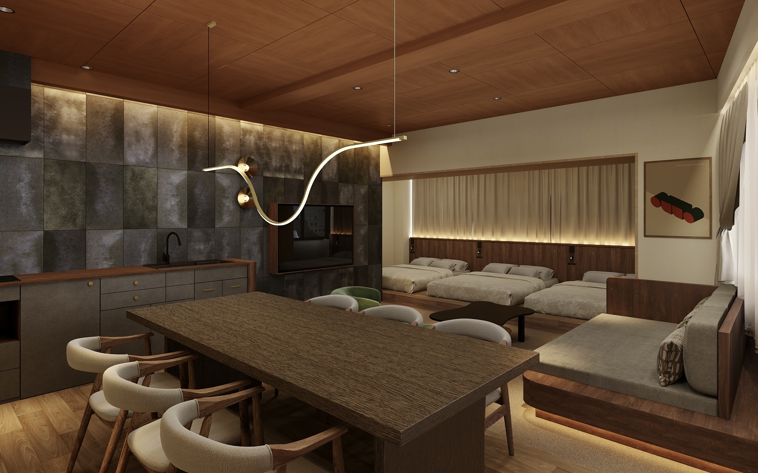 「Urban Retreat」をテーマに、天井の木目デザインや壁面の石の素材感、各所に施した間接照明が洗練された上質な空間を生み出し、グリーンのアイテムがミッドセンチュリーの遊び心と温かみを添えます。それぞれの過ごし方に寄り添うゾーニングと心地よいインテリアが、思い思いのくつろぎを自然と生み出します。交通利便性に優れ、多彩な飲食店が集まる五反田で、時間の流れがそっとゆるむひとときをお楽しみください。