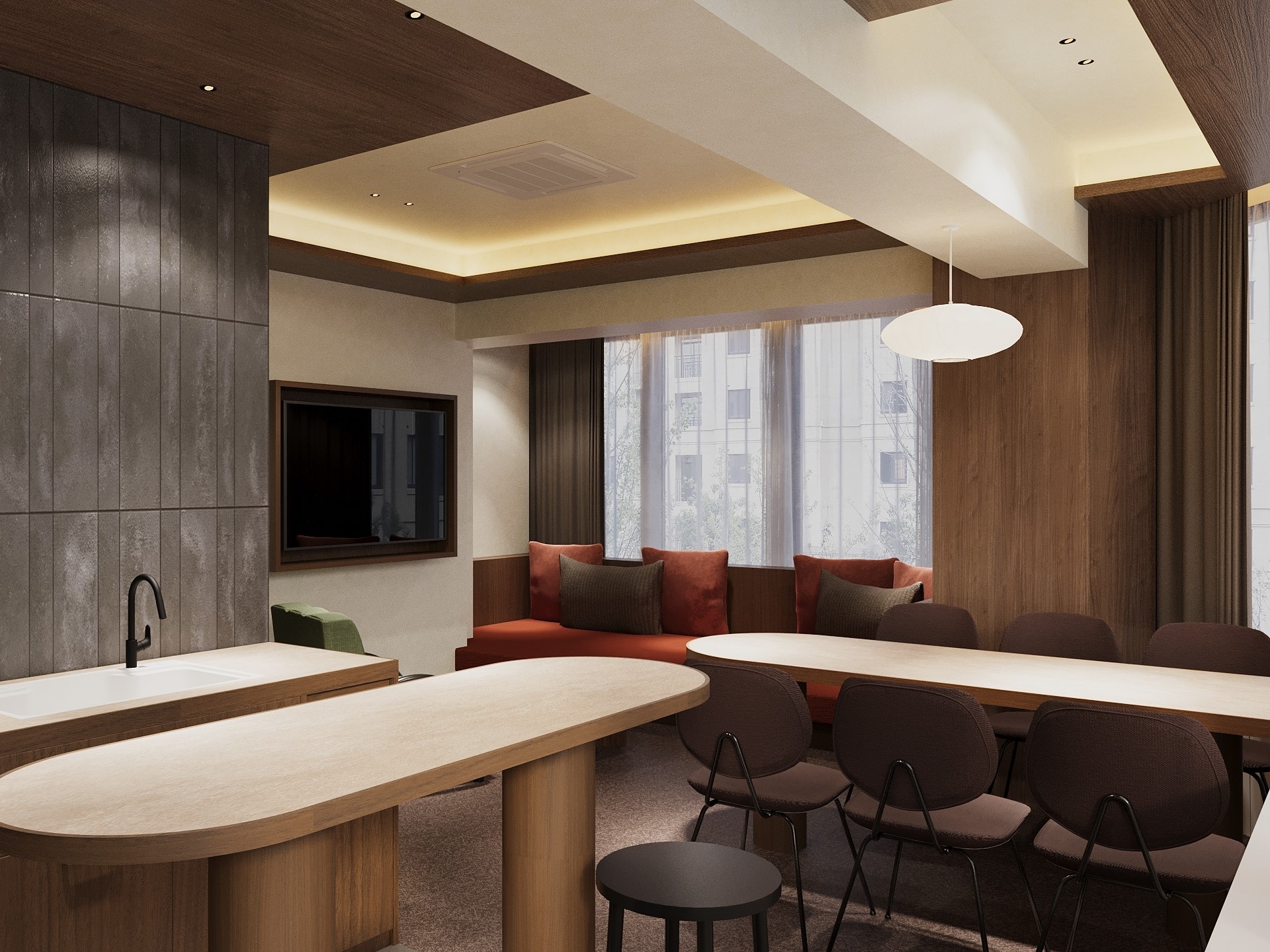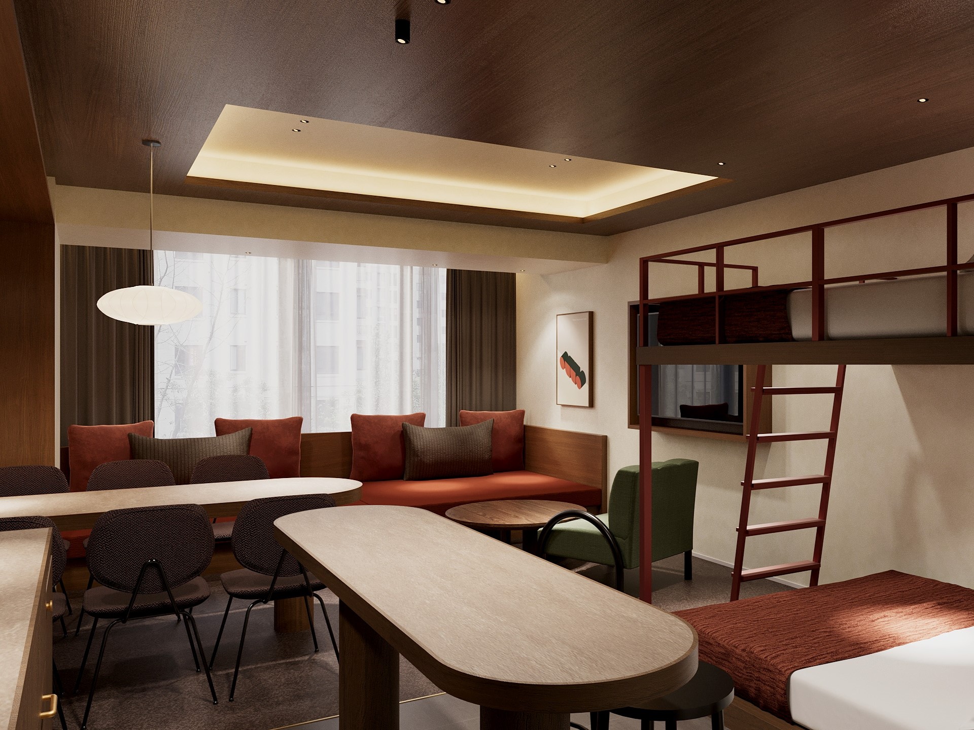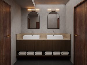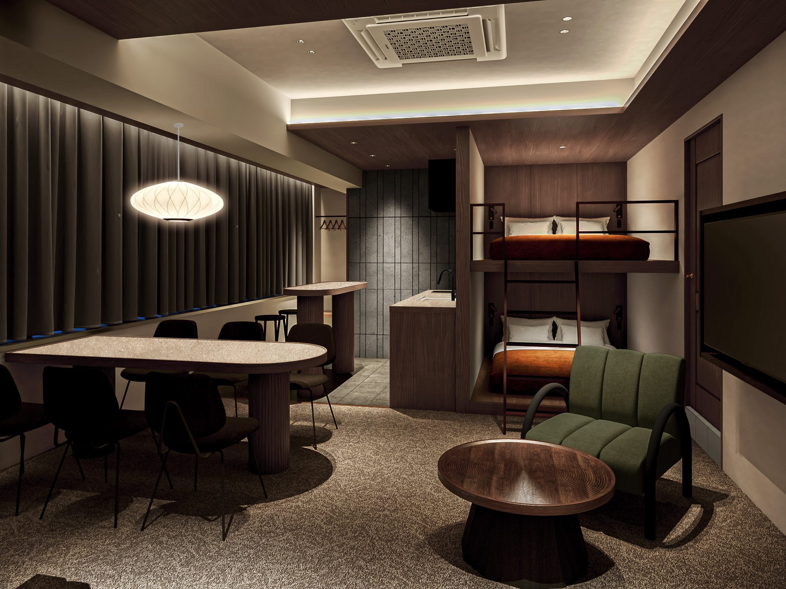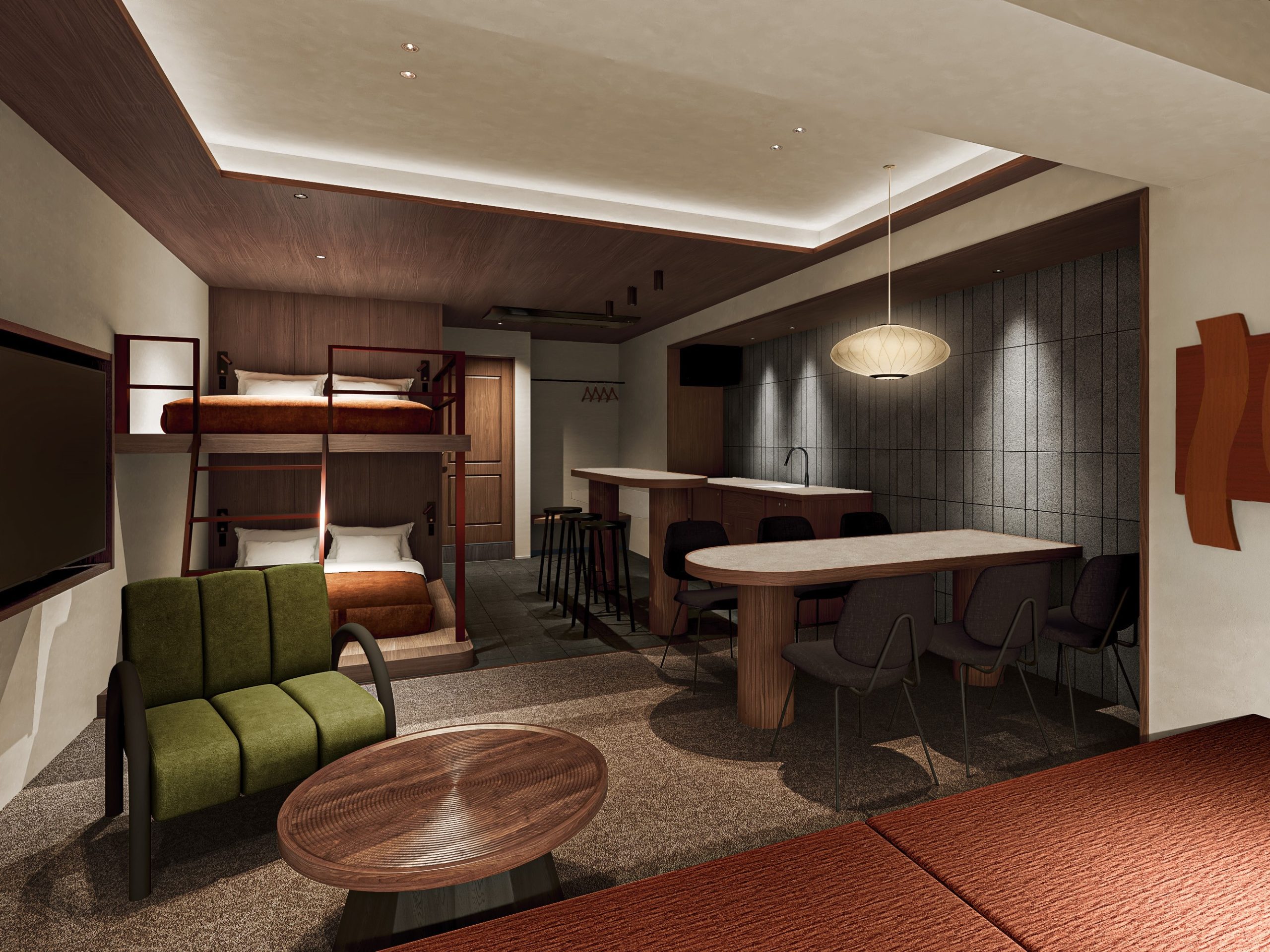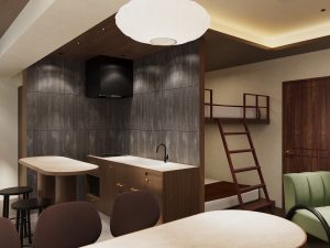 「箔」の品格と、ゆとりを感じさせる「余白」を名の由来とする「illi Haku Asakusa」は、深みのある木目や色彩を基調とした上質な設えです。リビングには印象的な家具を配し、キッチンには墨絵を思わせる壁面タイルをあしらうことで、浅草の伝統的な趣を感じる佇まいに仕上げました。浅草の観光名所へも足を運びやすい立地にあり、街歩きを満喫した後は、住まうようにくつろぐひとときをお楽しみください。