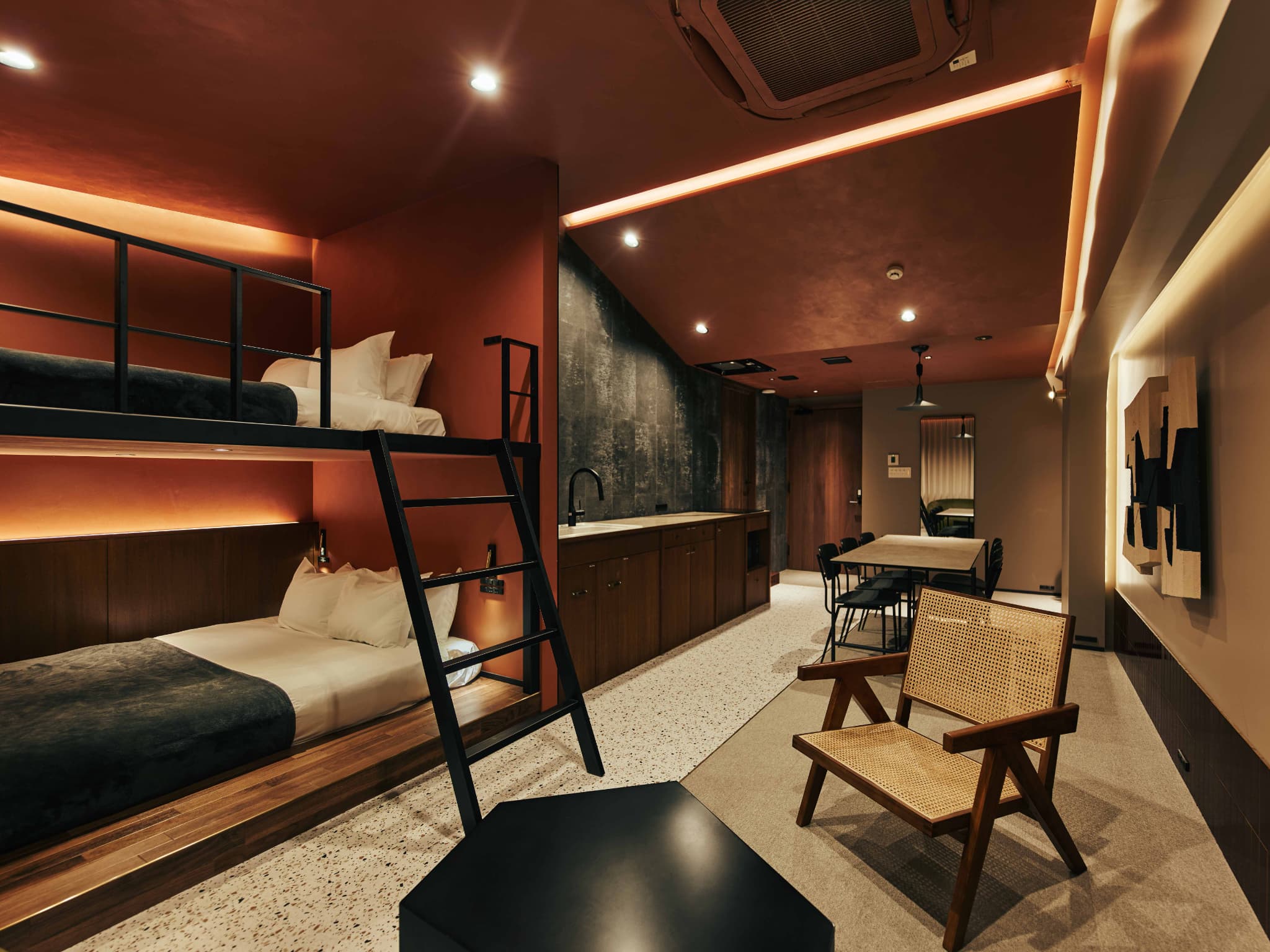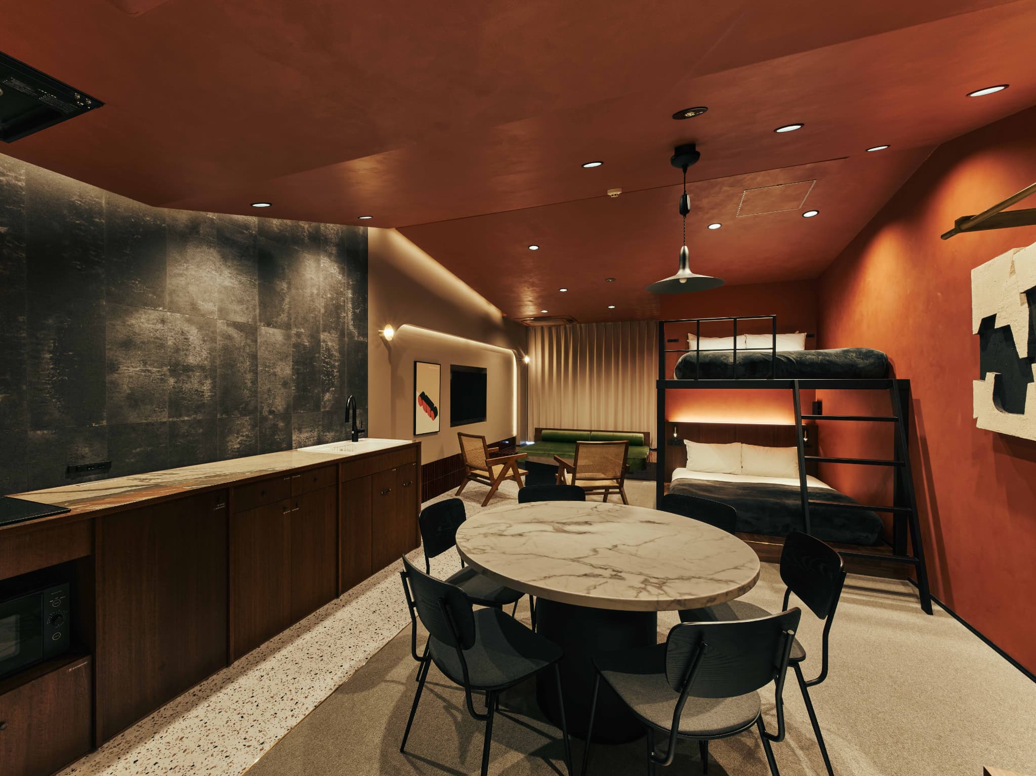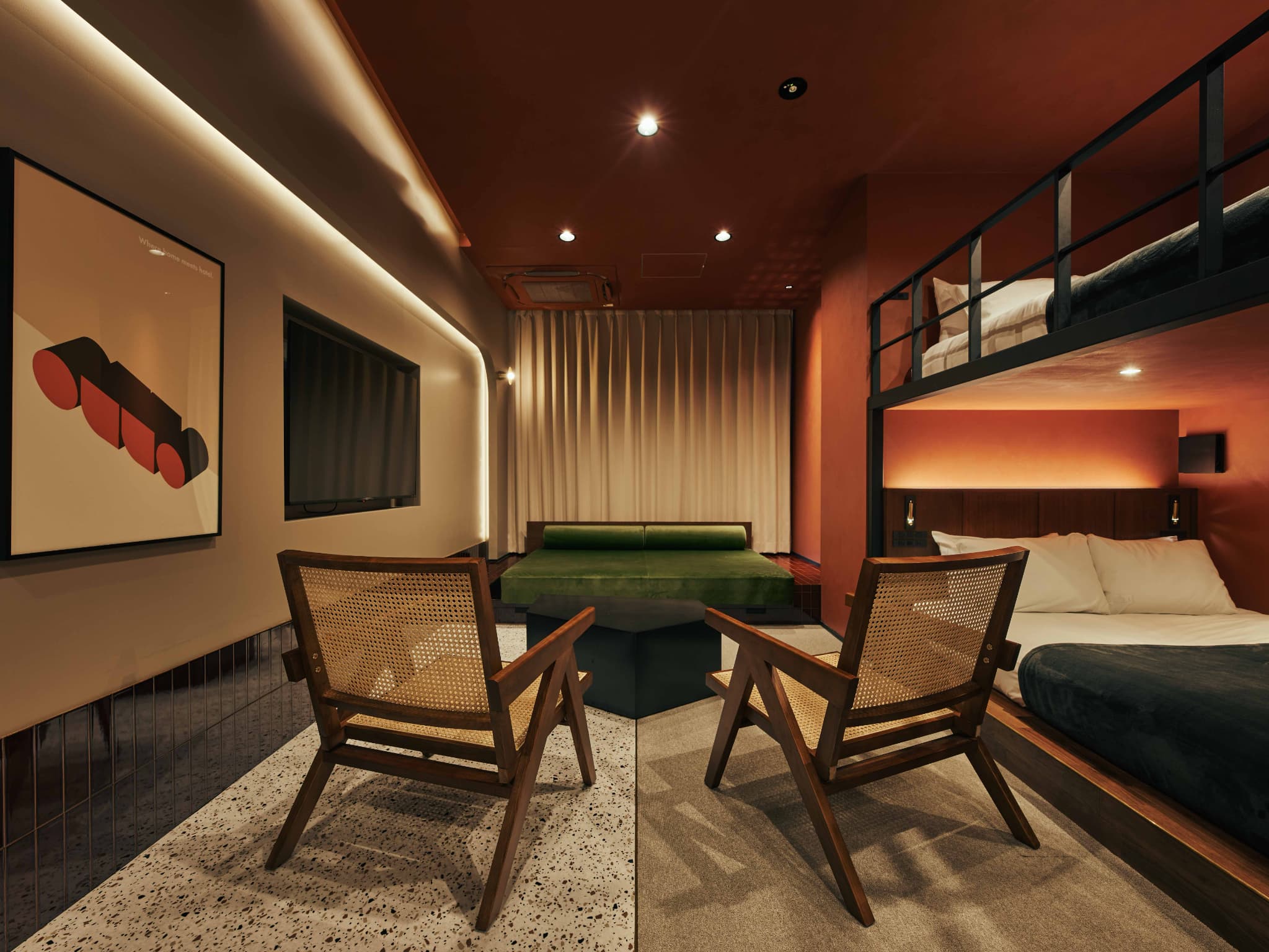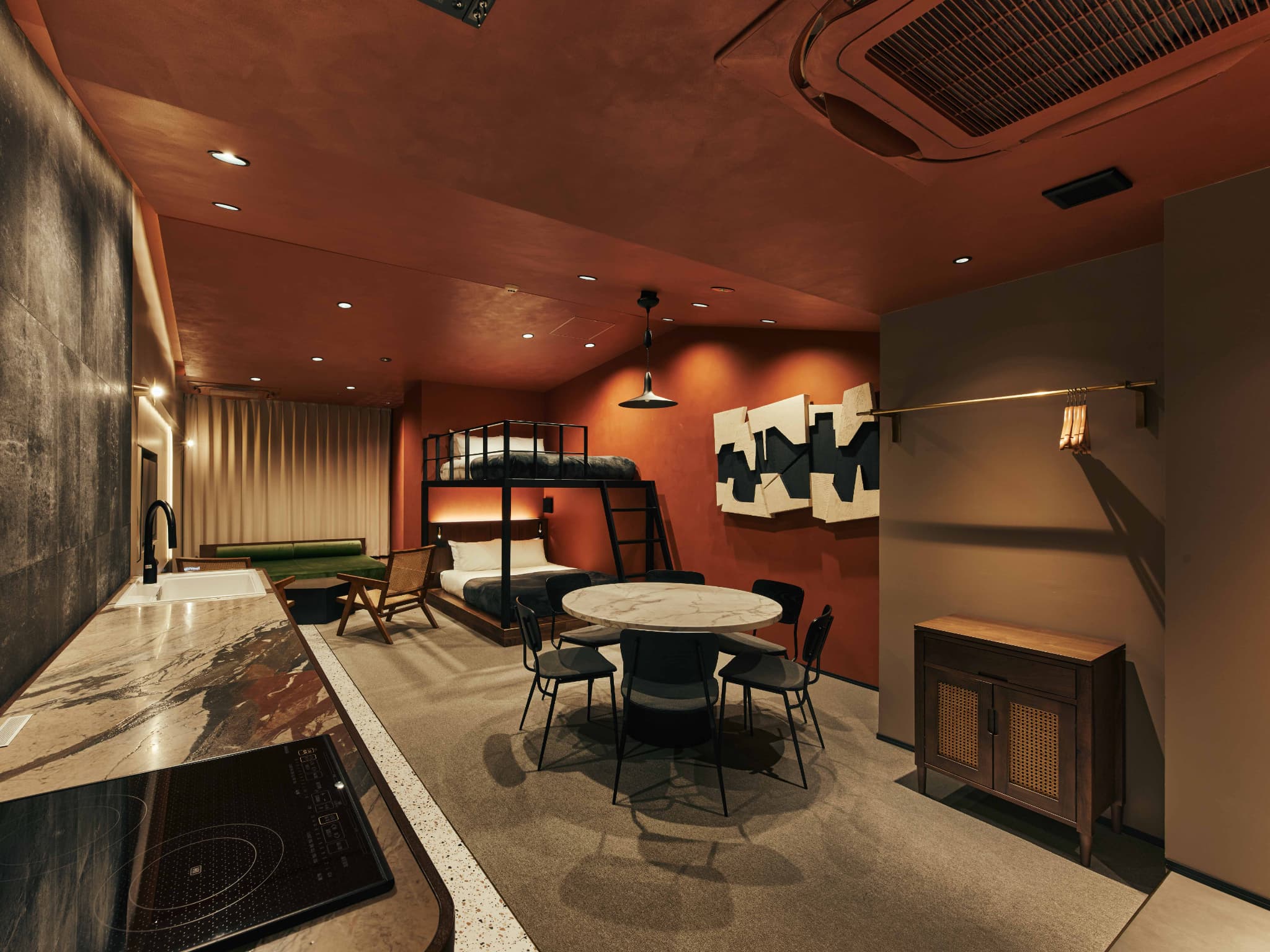 三角形をモチーフにした印象的なデザインに、テラコッタの温もりと上質な素材が調和し、客室に心地よい安定感をもたらします。高い天井が生む開放感の中で、ペントハウスのような贅沢なひとときをお楽しみいただけます。賑わう渋谷の中心に佇む、心をほどくあなただけのプライベート空間が待っています。