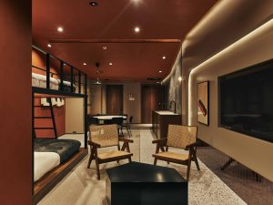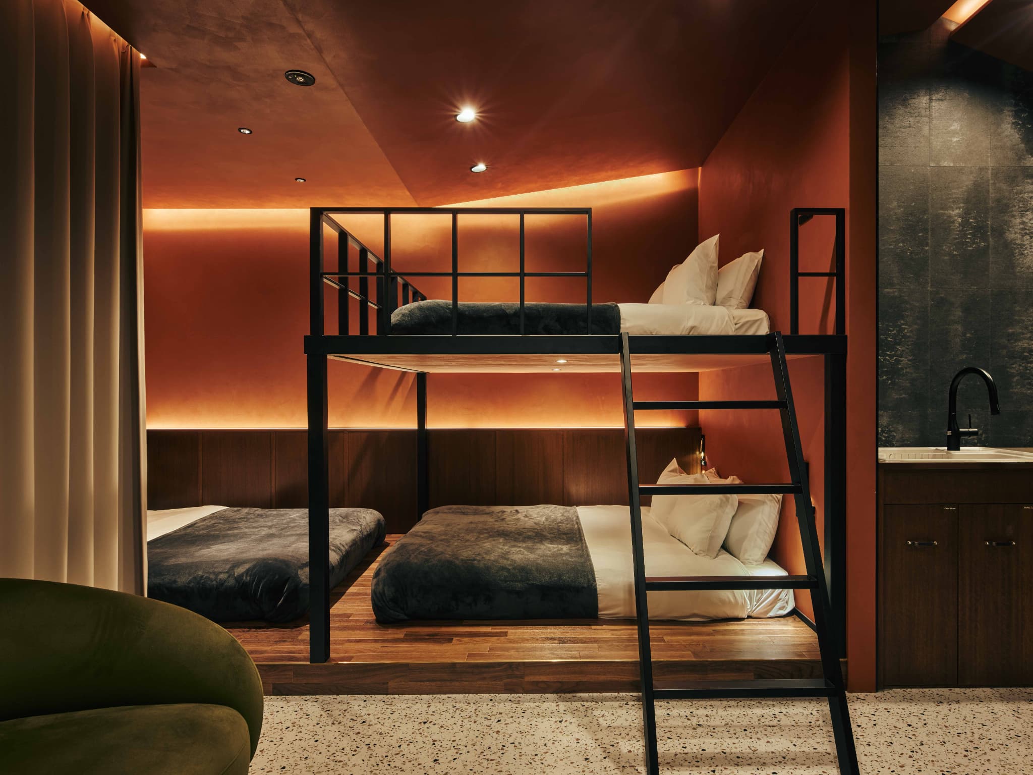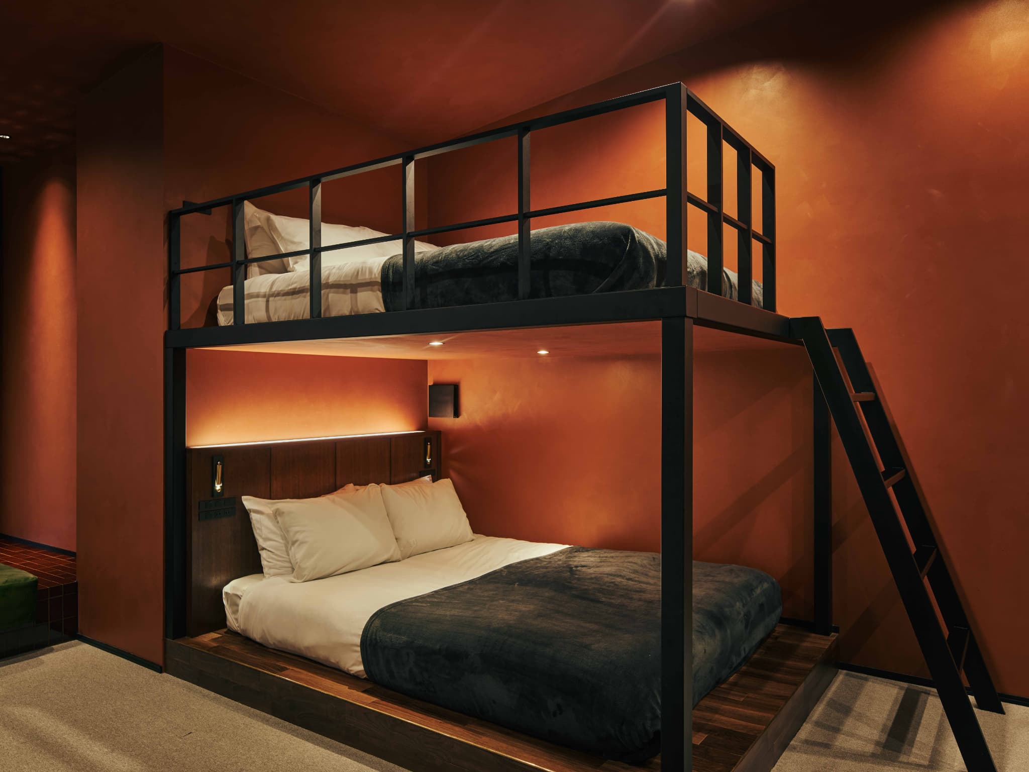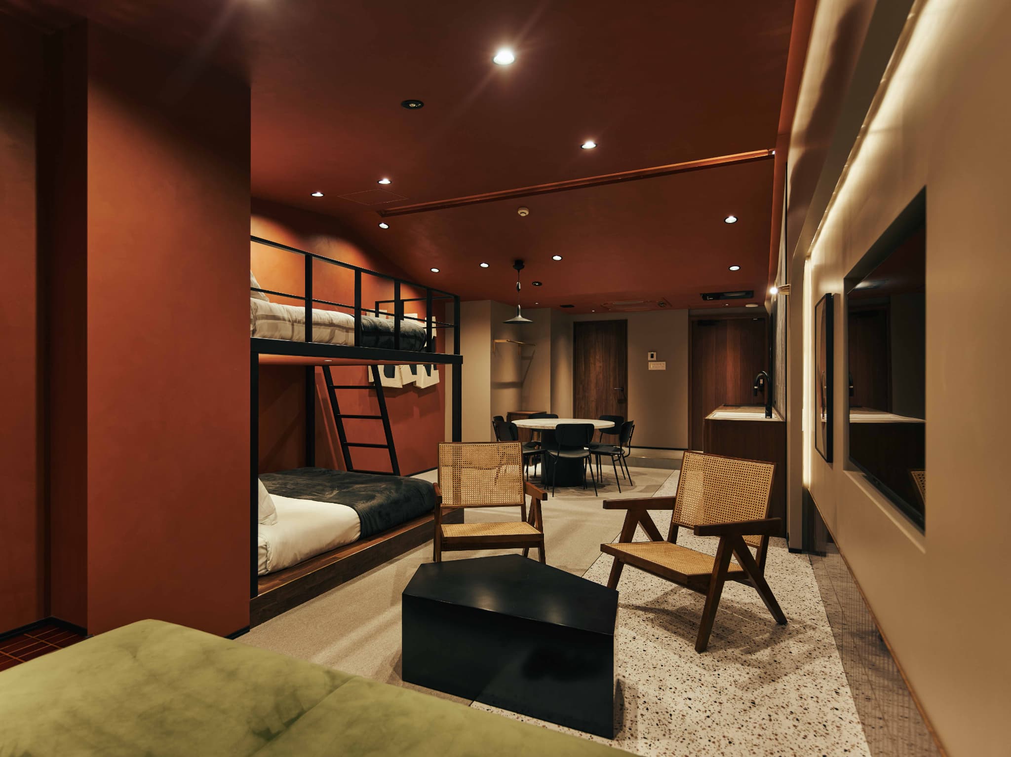 三角形をモチーフにした印象的なデザインに、テラコッタの温もりと上質な素材が調和し、客室に心地よい安定感をもたらします。高い天井が生む開放感の中で、ペントハウスのような贅沢なひとときをお楽しみいただけます。賑わう渋谷の中心に佇む、心をほどくあなただけのプライベート空間が待っています。