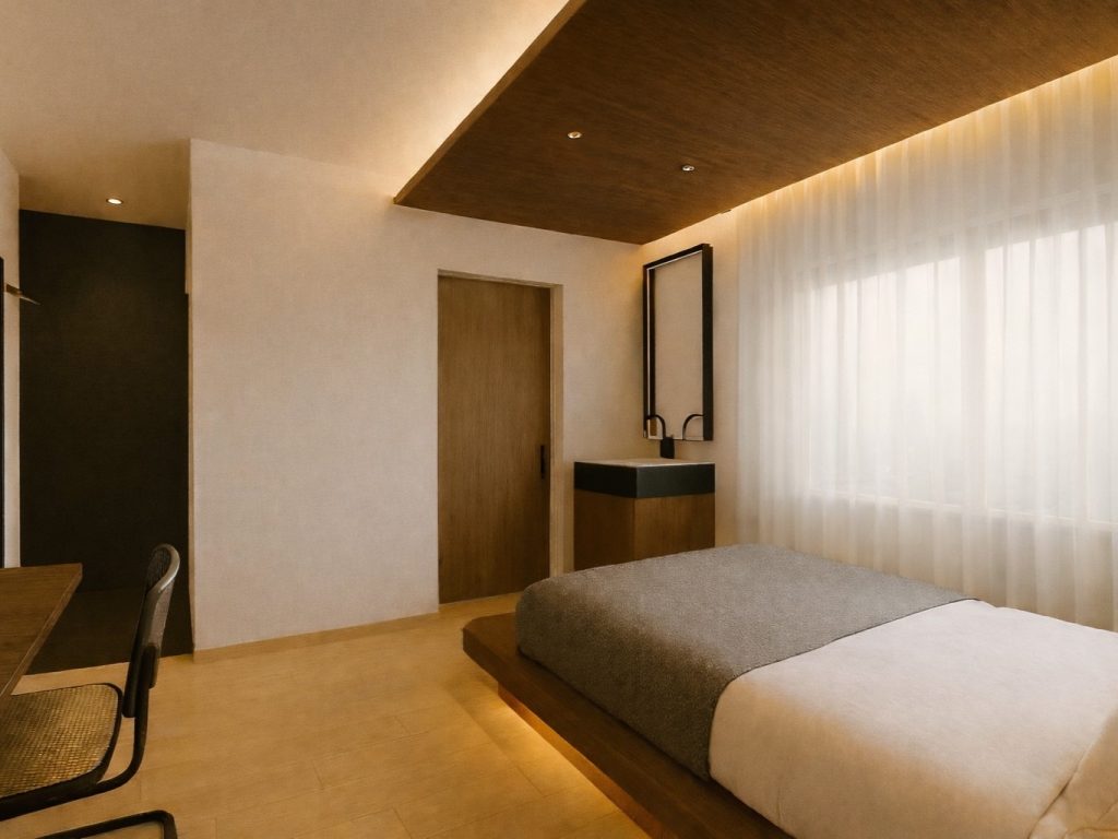 包み込まれるような安心感を与える天井と、温かな「2400K」の光が象徴的なお部屋。明日へ向けて心身をリセットする、至福のひとときをお過ごしください。